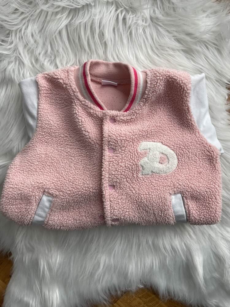 Predivna jaknica odnosno dzemper deblji u rozoj boji, sa slovom na lijevoj gornjoj strani, na kopcanje