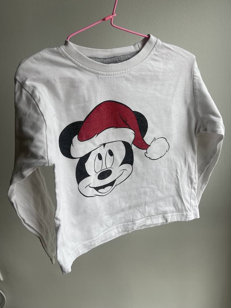 Bijela majica dugih rukava sa likom Miki Musa sa crvenom deda mraz kapom, odgovara velicini 98/104