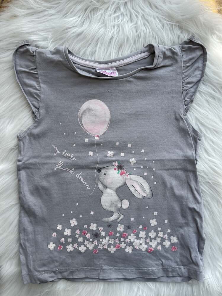 Predivna majica kratkih rukava sa likom zeca koji drzi balon, ima par malih ostecenja u vidu malih pocijepanih krugova (jedva se i primjeti)