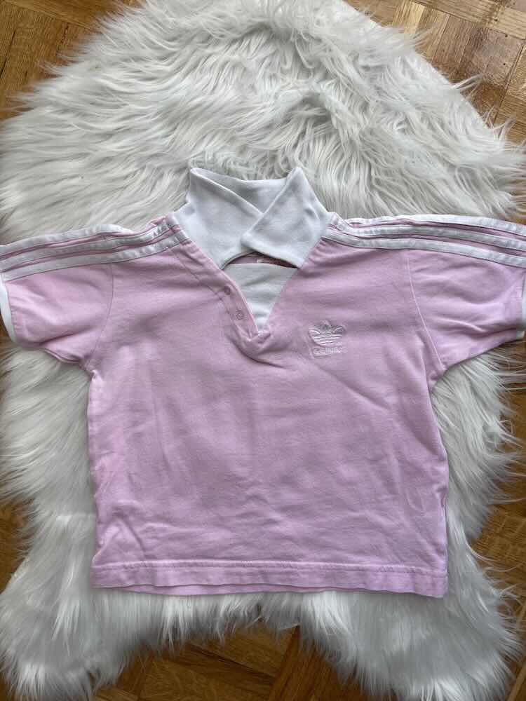 Divna majica marke Adidas u rozoj boji sa bijelim linijama i kragnom na kojoj postoji malo ostecenje, jedva vidljivo, u vidu blijedo zute boje