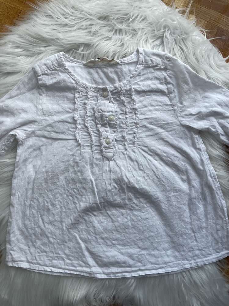 Predivna, prelagana majica dugih rukava bijele boje sa volanima na sredini