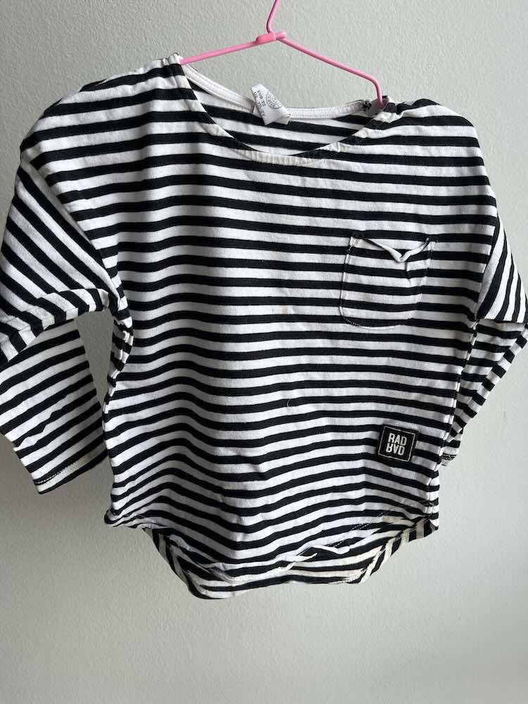 Divna majica, lagana, sa prugama, ima jednu manju flekicu na sredini majice i na desnom rukavu (moze posluziti za po kuci ili u bastici)