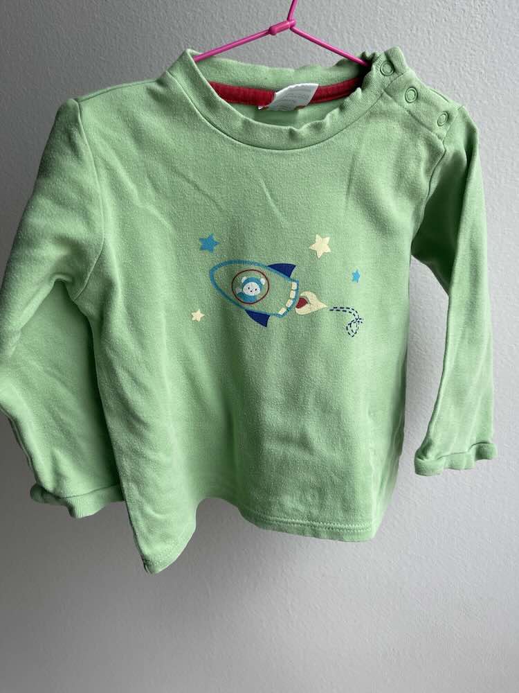 Preslatka majica zelene boje sa printom rakete i mede, odgovara velicini 86/92